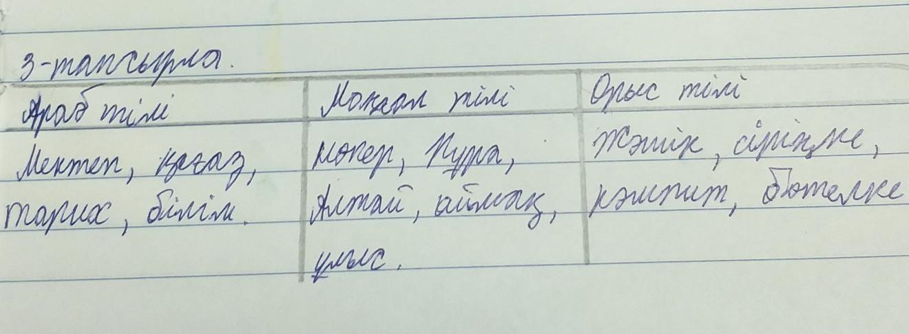 3-тапсырма. Төменде берілген кірме сөздерді кестеге толтырыңыз.