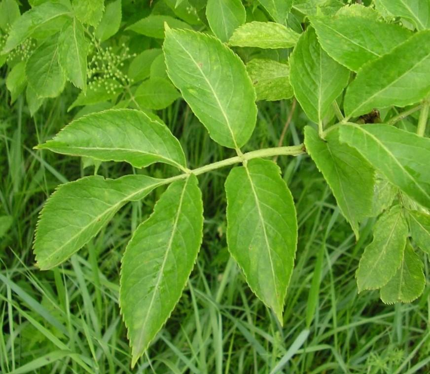 У листьев бузины - супротивное листорасположение (1 узел - 2 листа).