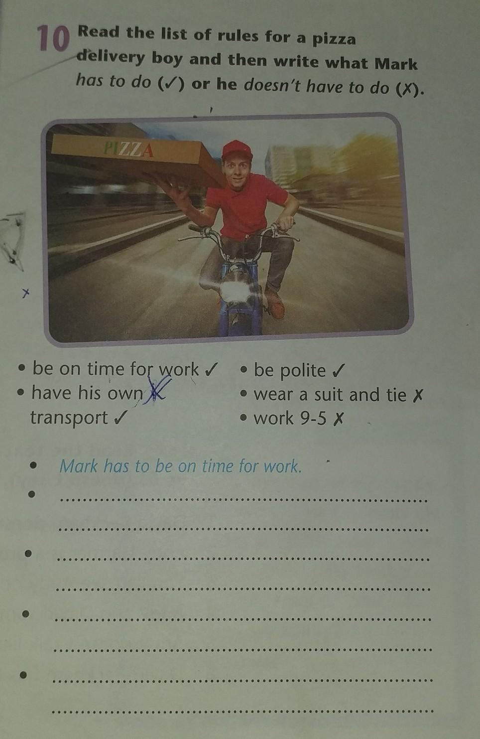 10 Прочтите список правил для пиццы курьер, а потом напиши, что марки должен делать (ſ) или не должен делать (). ПИЦЦА • приходить на работу вовремя ✓ • иметь свой транспорт • быть вежливым • надеть костюм и галстук X • работа 9-5 раз Мартохормор работа