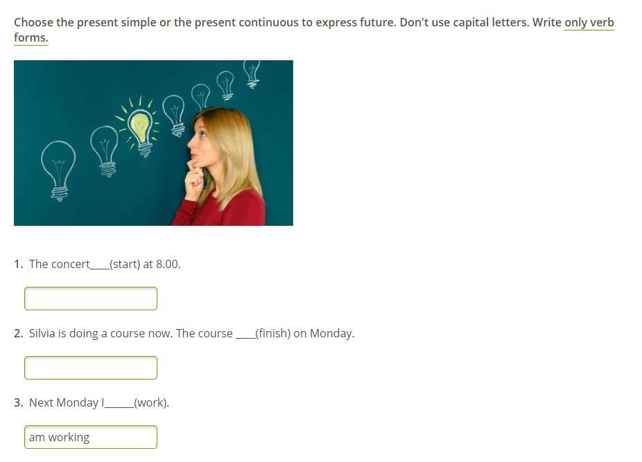 Choose the present simple or the present continuous to express future. Don't use capital letters. Write only verb forms.