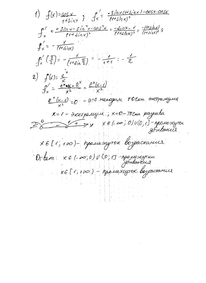 1)знайти f'(п/2),якщо f(х)=cosх/1+sinх.(це по формулам диференціювання)