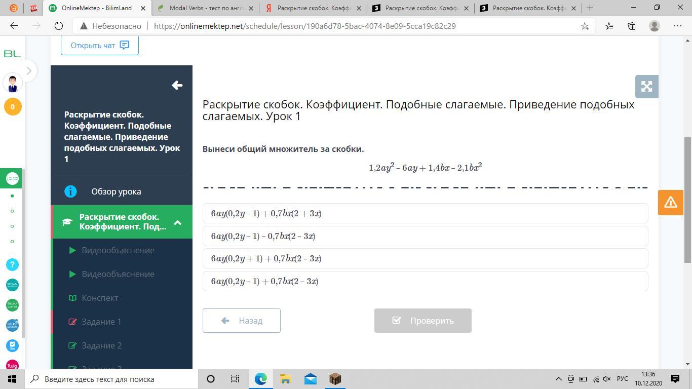 1) 6ay(0,2y – 1) + 0,7bx(2 + 3x) =