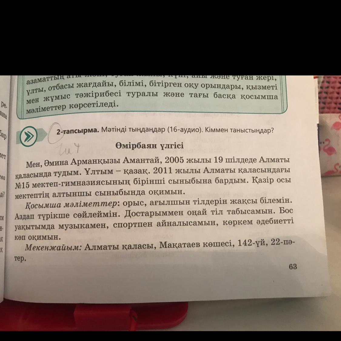 2 — тапсырма, 63 бет. Мәтінді оқыңдар. Мэтін бойынша 3 сұрақ кұрастырыңдар. 1. 2. 3. Мәтін ішіндегі сан есімдерді сөзбен жаз