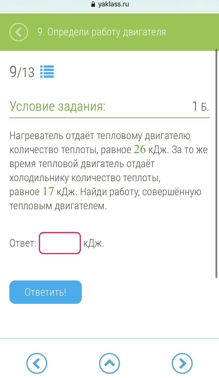 Нагреватель отдаёт тепловому двигателю количество теплоты, равное 26 кДж. За то же время тепловой двигатель отдаёт холодильнику количество теплоты, равное 17 кДж. Найди работу, совершённую тепловым двигателем. (Ребят срочнооо, дам 15 баллов)