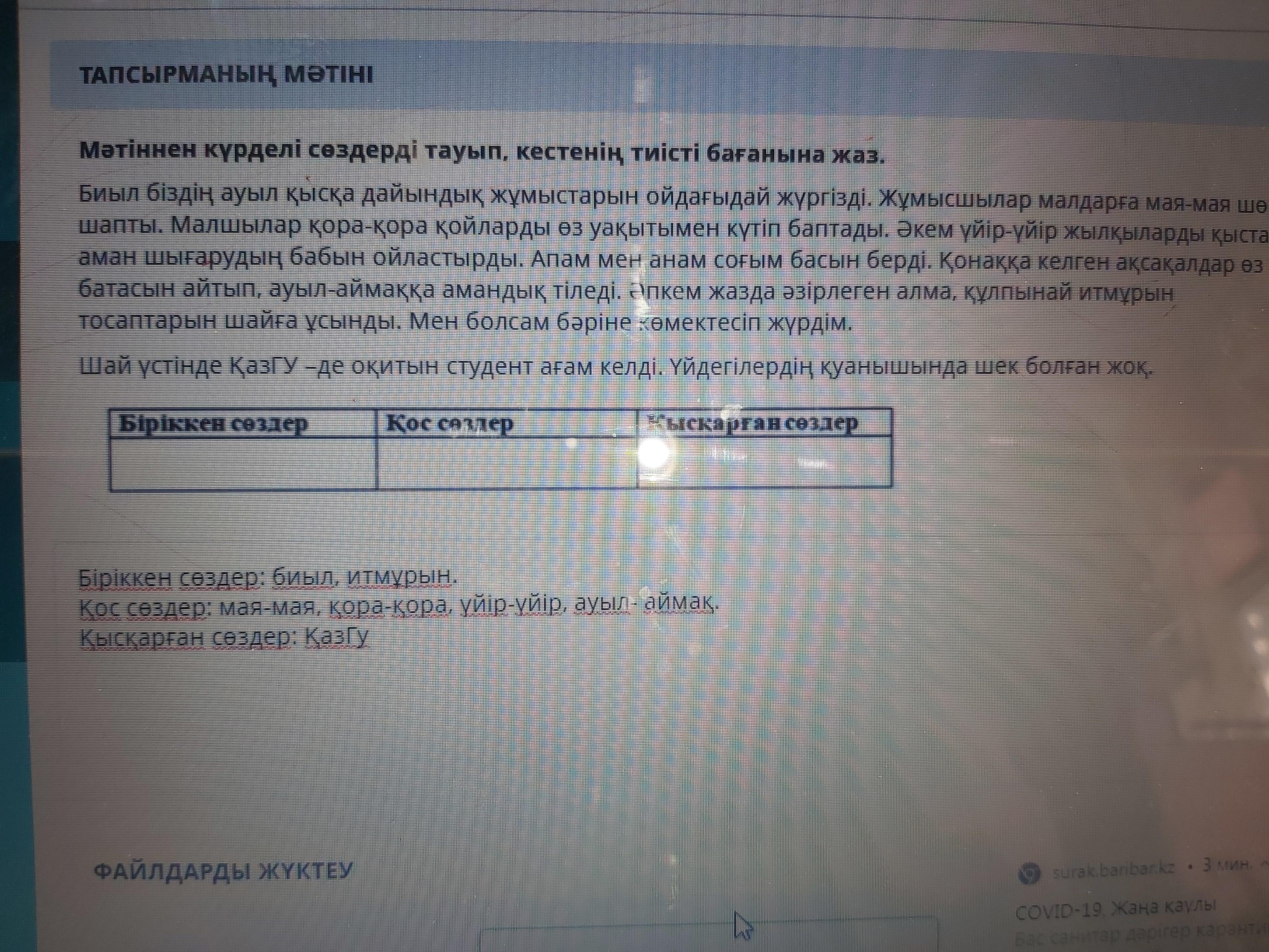 Мәтіннен күрделі сөздерді тауып, кестенің тиісті бағанына жаз.