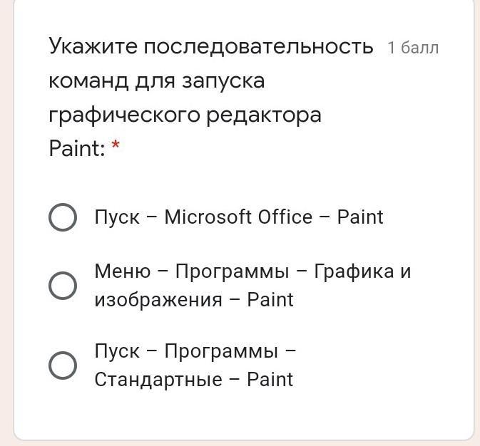 Укажите последовательность 1 балл команд для запуска графического редактора Paint: * О Pi*y – Microsoft Office Меню – Программы изображения – Paint О О Paint - Gamma Графика и Пуск - Pi Программы - Стандартные – Paint