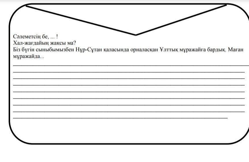 Маған мұражайда көнеден келе жатқан ұлытымздың құнды, бағалы заттар қатты ұнады. Мысалға: құмыра ол өте әдемі ежелгі қазақтың ою-өрнегімен жасалған. Ал маған тағы да өте көнеден келе жатқан ыдыс аяқтарға көзім түсті. Көркемдігі соншалық қарасаң көздің жауын алады. Әттең біз онда көп уақыт болмадық. Бірақта көп нәрсені біліп, көріп таныстым. Маған мұражай қатты ұнады. Сенде мені хатымнан мұражайды елестете алдың деген ойдамын. Сәлеммен (өзіңнің аты-жөніңді жазасың) сонымен болды. (Кішкене болсын көмегім тисе қуаныштымын♥️)