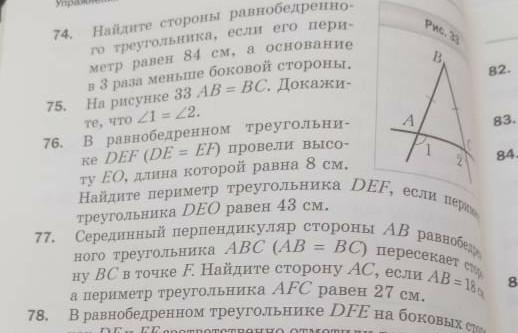 75) Т.к. AB = BC , а это стороны треугольника при основании, то это треугольник равнобедренный, а значит углы при основании равны.