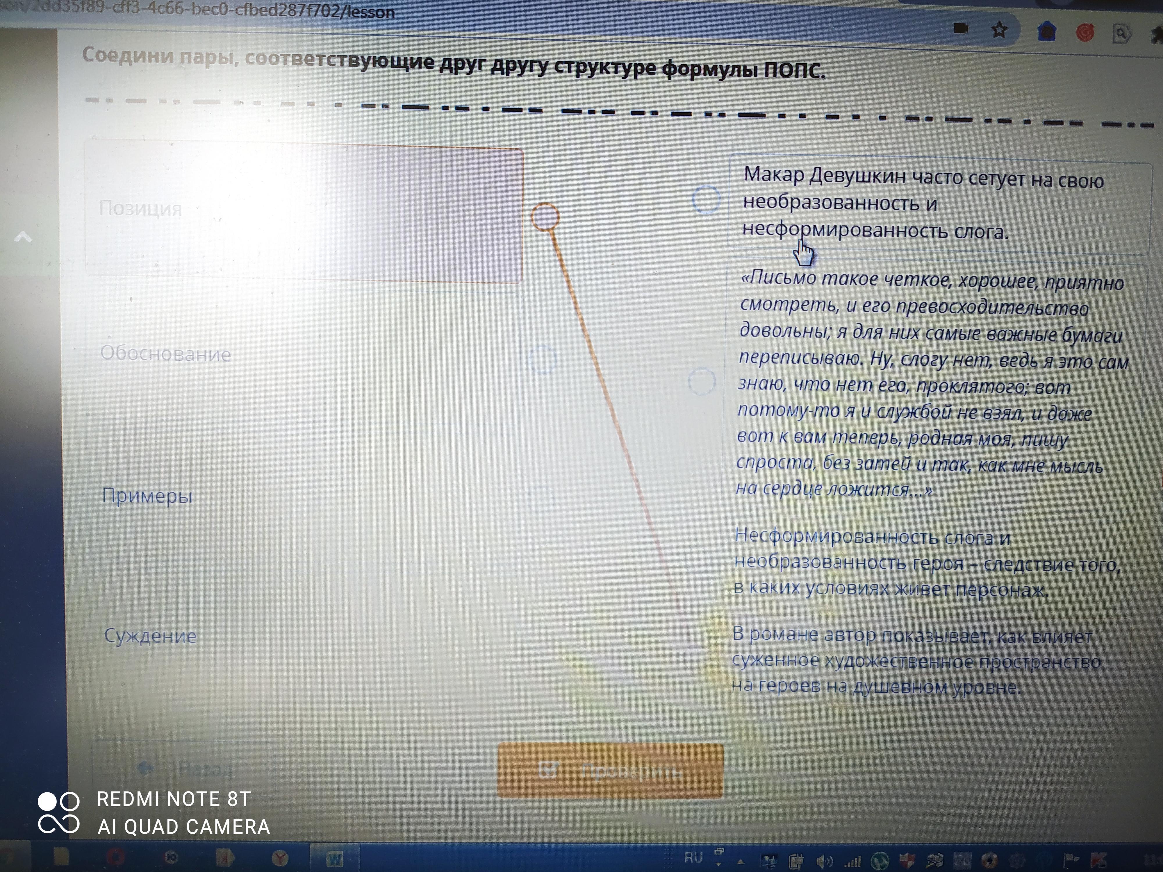 Позиция - В романе автор показывает как. Обоснование - Макар Девушкин часто сетует. Примеры - Письмо такое чёткое хорошее.