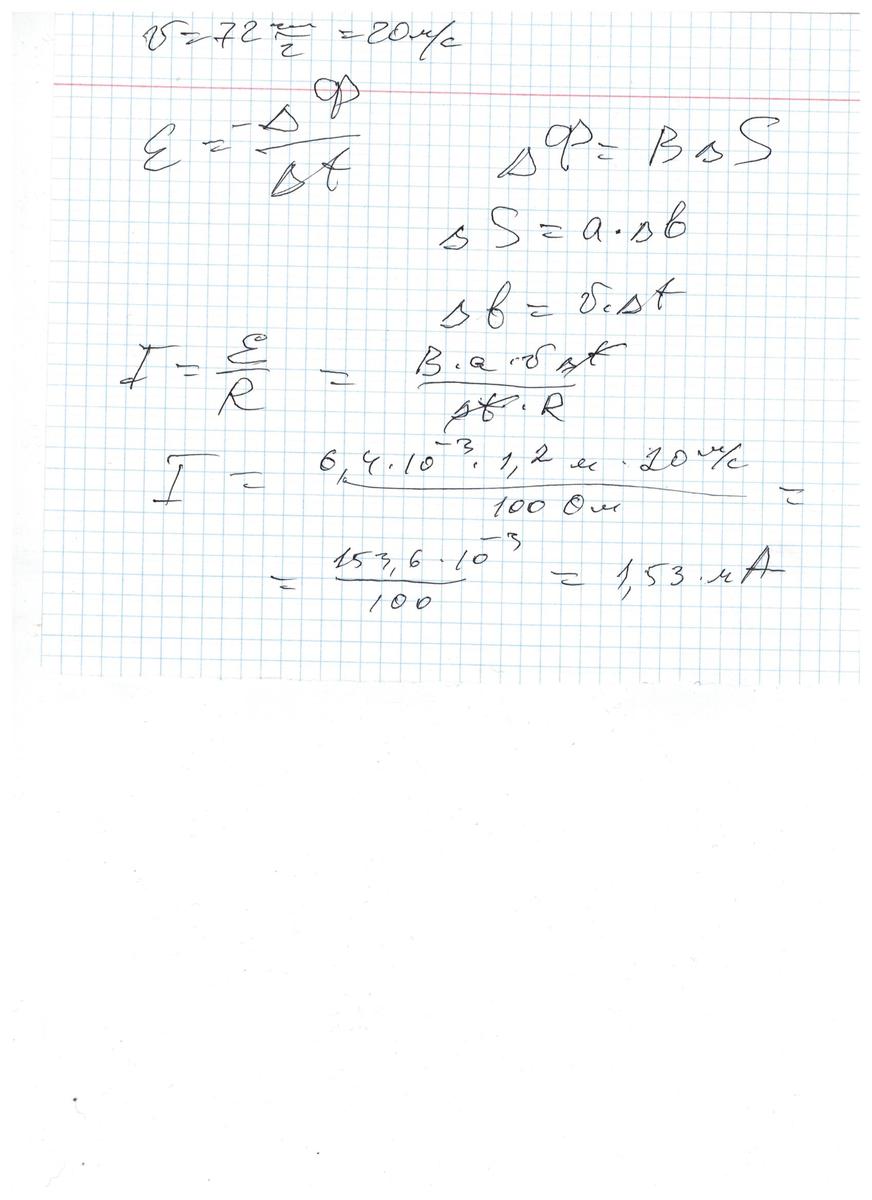 Найдите силу тока, который пойдет через гальванометр, присоединенный к железнодорожным рельсам, если к нему со скоростью 72 км/ч приближается поезд. Вертикальная составляющая магнитной индукции магнитного поля Земли 6,4мТл; сопротивление цепи 100 Ом; расстояние между рельсами 1,2 м. Рельсы считайте изолированными одна от другой и от Земли.