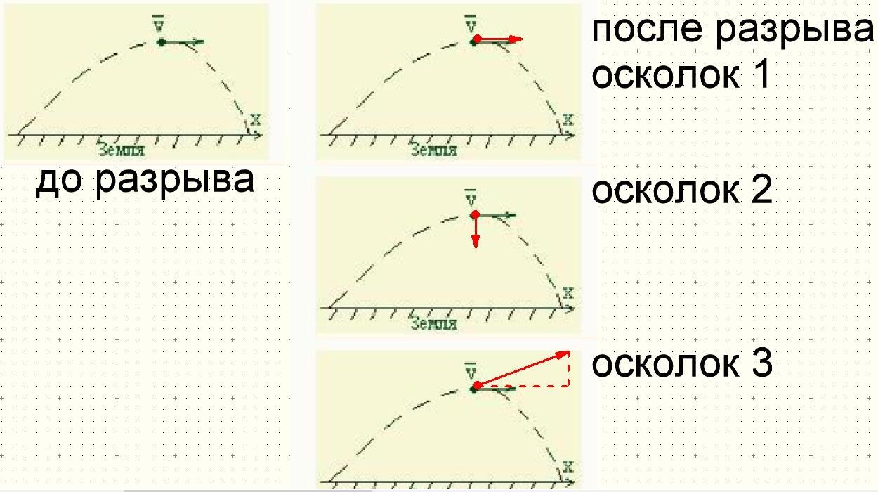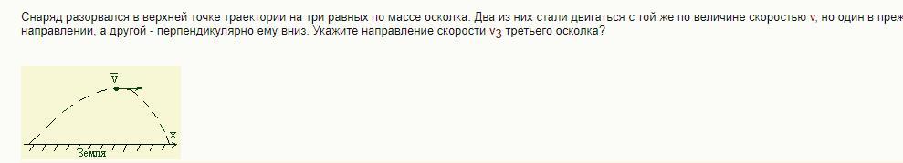 Снаряд разорвался в верхней точке траектории на три равных по массе осколка. Два из них стали двигаться с той же по величине скоростью v, но один в прежнем направлении, а другой - перпендикулярно ему вниз. Укажите направление скорости v3 третьего осколка?