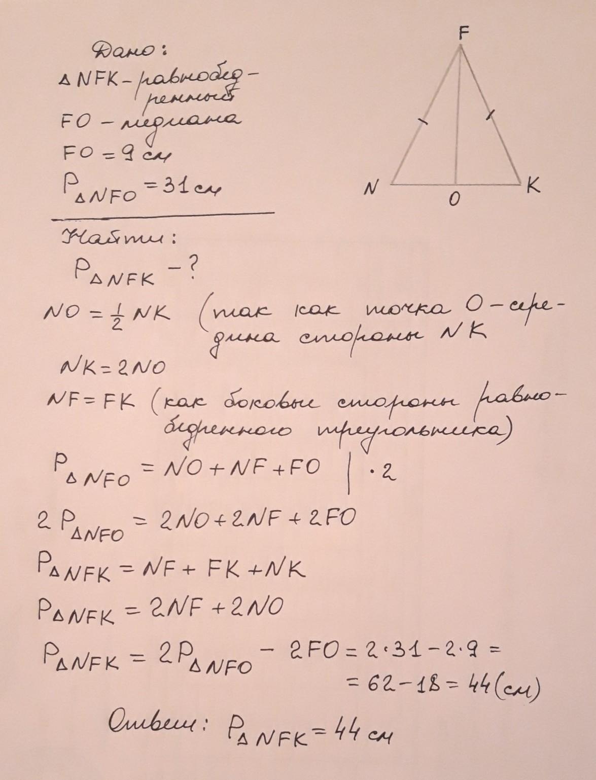 Найдите периметр ANFK, если длина FО 9 см, а периметр NFO равен 31 см.