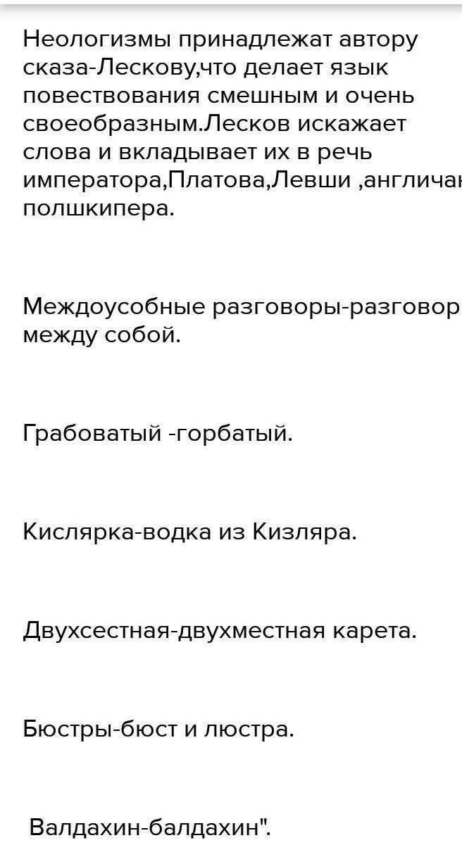 Обратите внимание на язык сказа Н.С. Лескова «Левша». Выпишите не менее пяти примеров искаженных слов или выражений и постарайтесь объяснить, какой дополнительный смысл они приобрели. Например: студинг — слово «пудинг», переосмысленное как родственное слову «студень», «студеный». С помощью такого искажения показано, что Левше трудно понять иностранные реалии, что он воспринимает жизнь в привычных ему рамках.