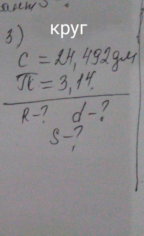1) С = 2ПR. Значит, R = C/2П = 24,492/6,28 = 3,9 дм. (радиус).