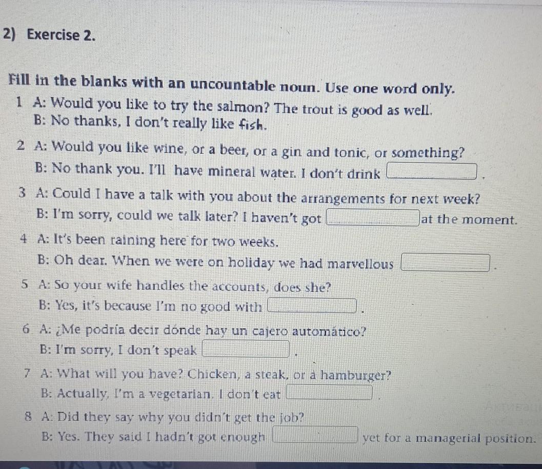2 alcohol 3 time 4 weather 5 math 6 Spanish 7 meat 8 experience