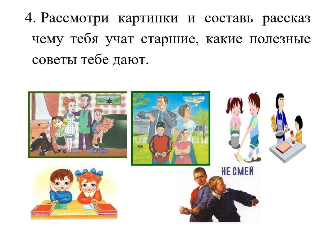 4. Рассмотри картинки и составь рассказ чему тебя учат старшие, какие полезные советы тебе дают. ПОМОГИТЕЕЕ плиз