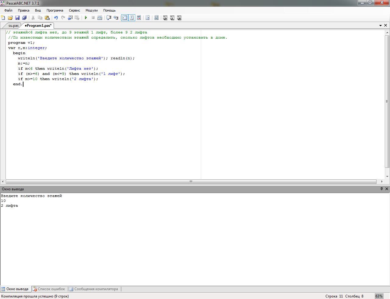 Задача 1. По строительным нормам дома, ниже шести этажей, не должны иметь лифт. Дома высотой до девяти этажей должны иметь один лифт, более высокие дома - два лифта. По известным количеством этажей определить, сколько лифтов необходимо установить в доме.