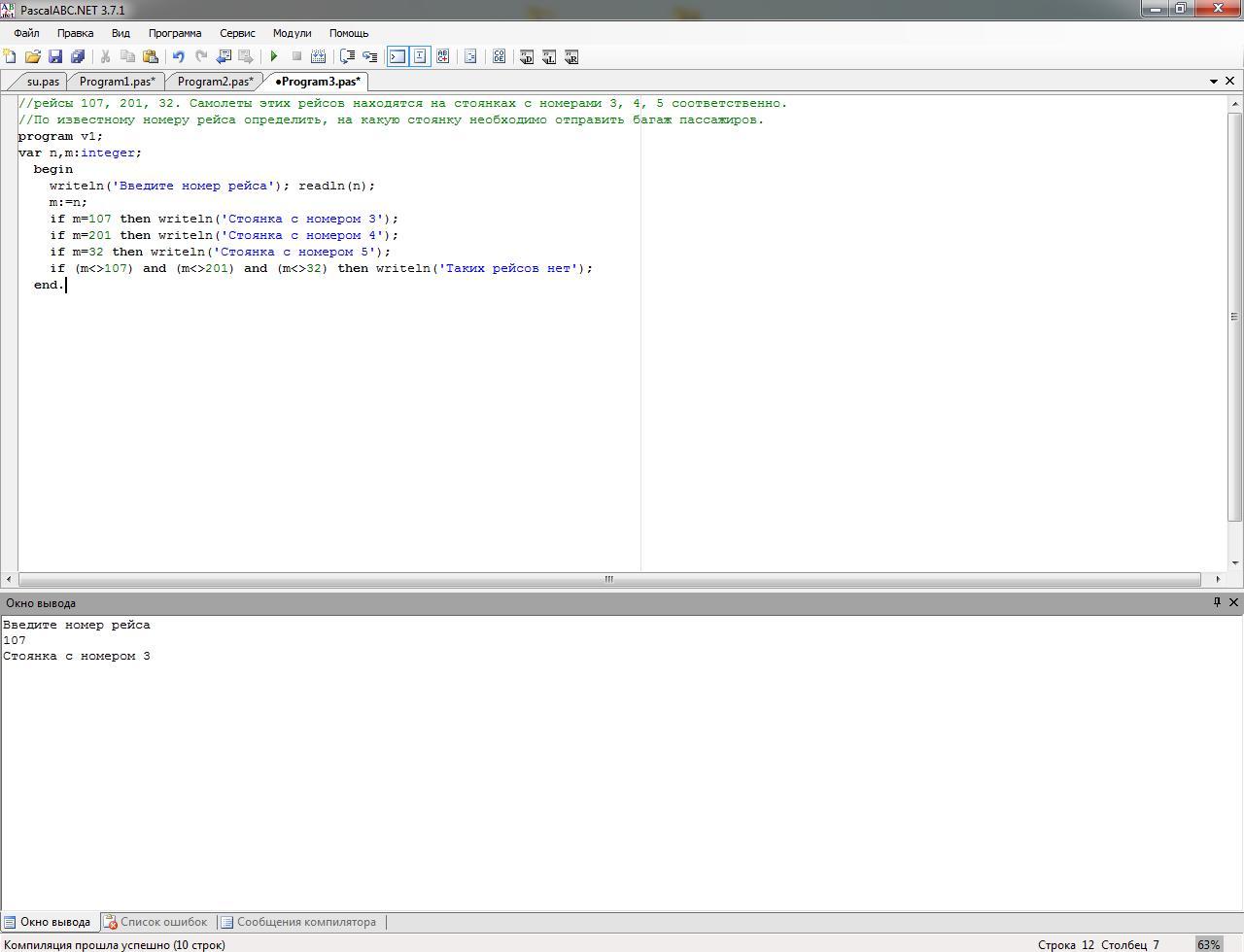 Задача 2. В аэропорту выполняется регистрация билетов на рейсы 107, 201, 32. Самолеты этих рейсов находятся на стоянках с номерами 3, 4, 5 соответственно. По известному номеру рейса определить, на какую стоянку необходимо отправить багаж пассажиров.