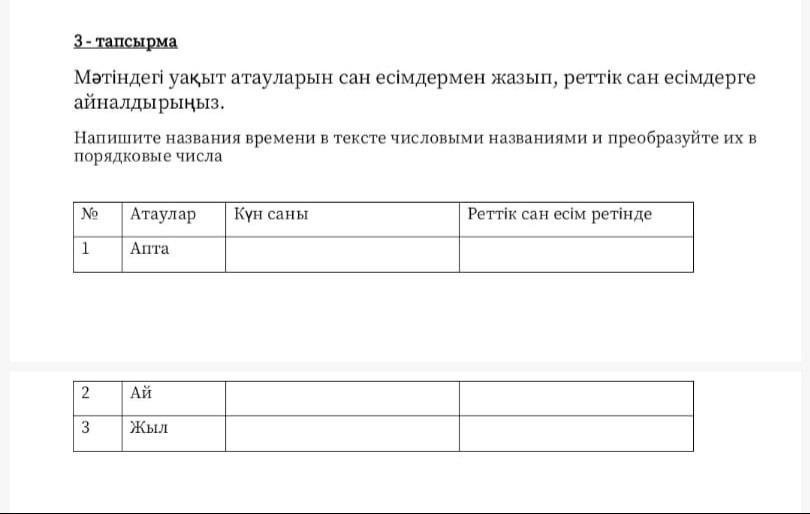 Ответ: 1. АПТА _7_ жетінші 2. Ай_30,31_ отызыншы, отыз бірінші 3. Жыл_365_ үш жүз алпыс бесінші