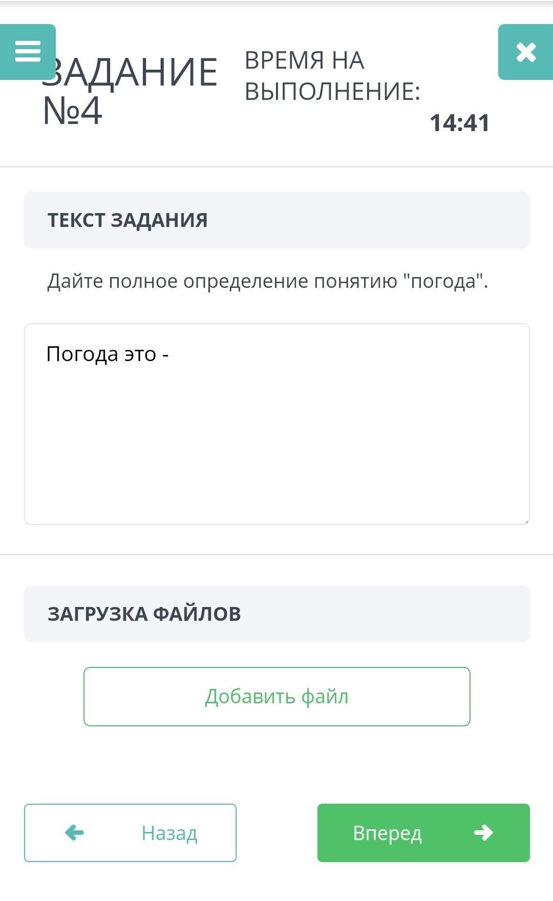 Погода - это определённое состояние атмосферы в данном месте, в данное время.