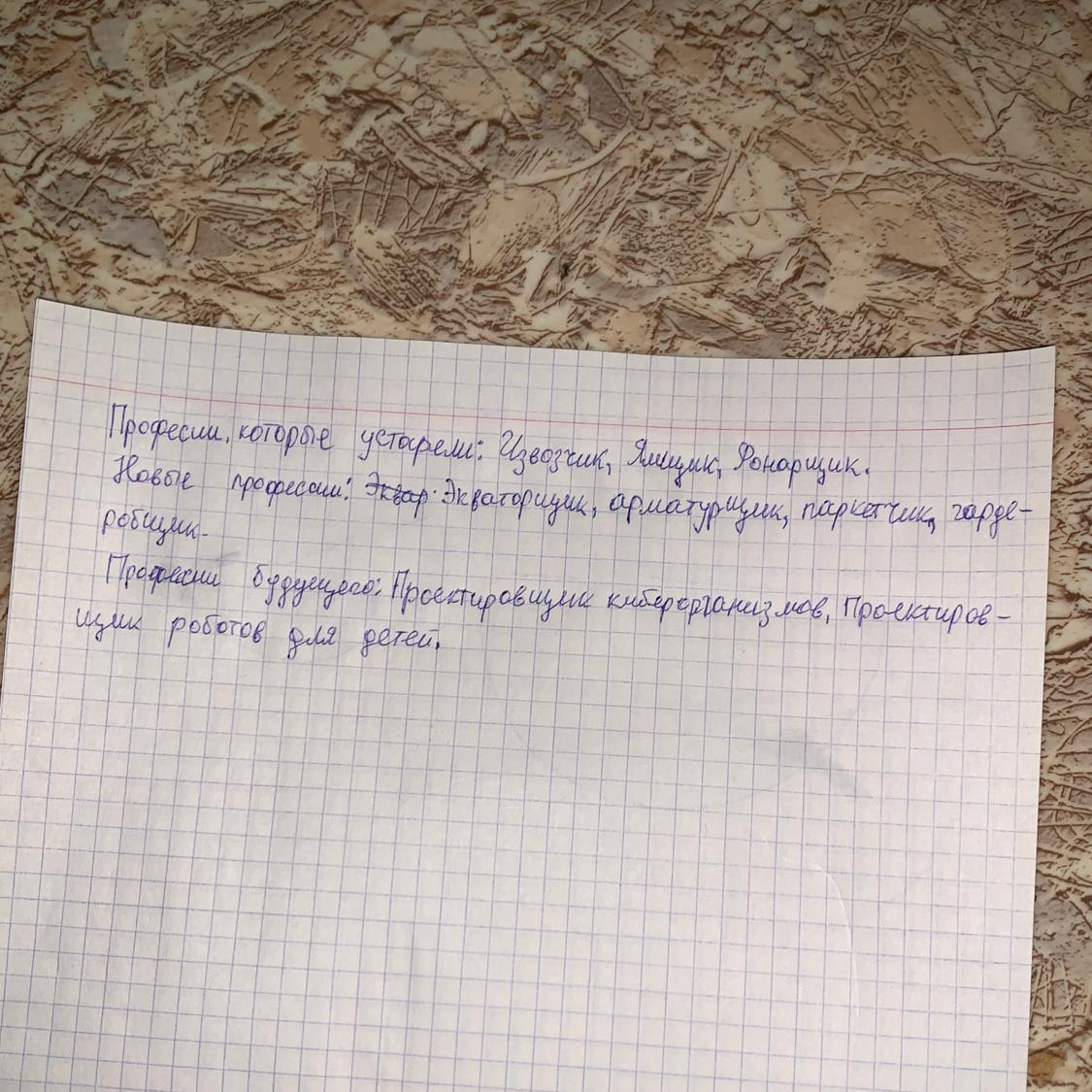 Устаревшие профессии:Извозчик,Ямщик,Фонарщик. Новые проф:Экваторщик,Арматурщик,Паркертчик,Гардеробщик. Проф. будущего: Проектировщик киберорганизма, Проектировщик роботов для детей