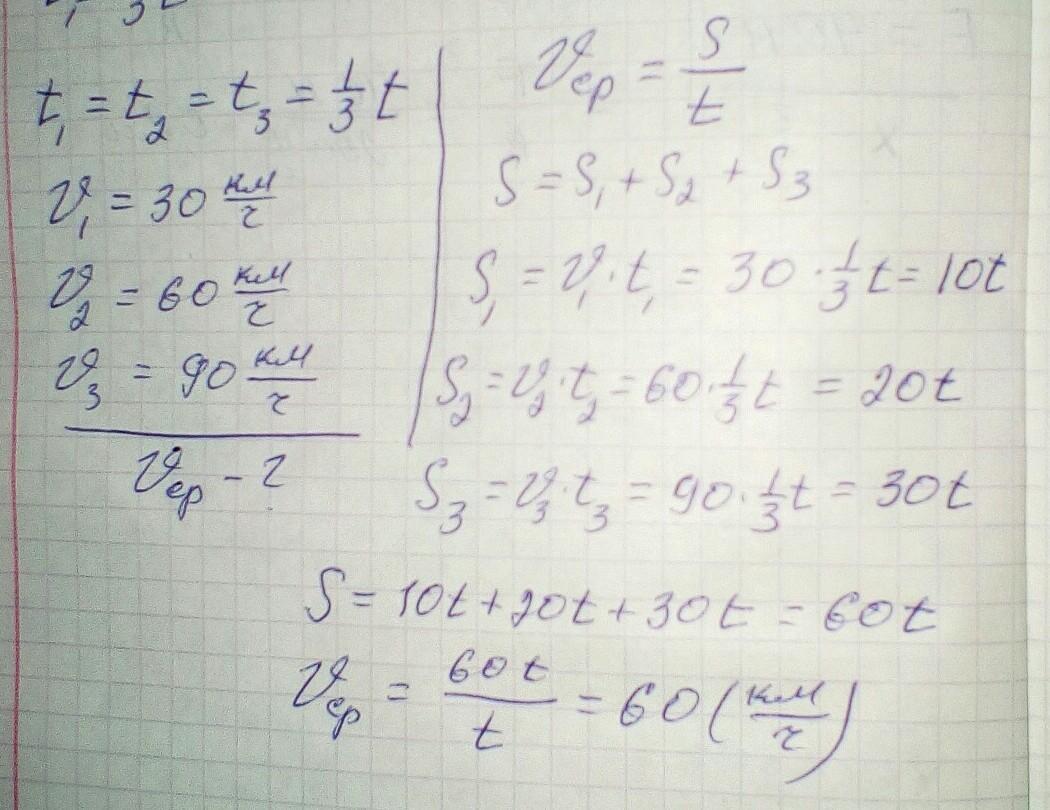 Физика. Найдите среднюю скорость автомобиля, если 1 треть времени он двигался со скоростью - 30 км/ч, 2 - 60 км/ч, 3 - 90 км/ч.