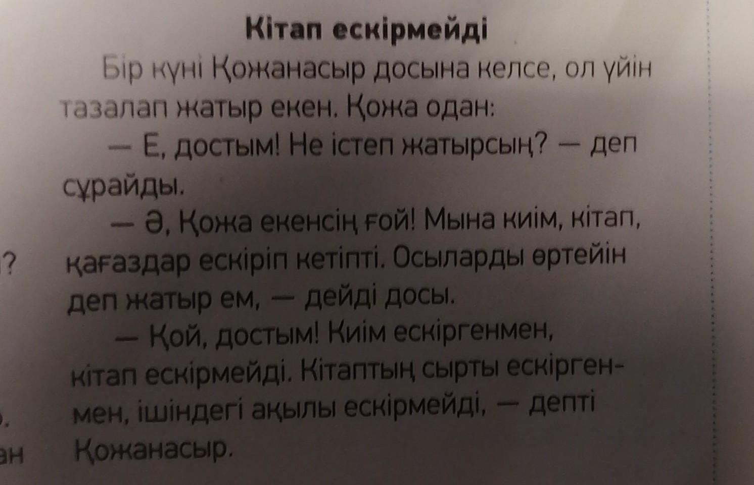 Однажды Кожанасыр пришел к своему другу и увидел, что он убирается в доме. Ходж сказал ему: - Ну, друг мой! Что ты делаешь - спрашивает он, - Ой, ты Ходжа! Эта одежда, книги, бумаги устарели. Я сожгу их, - говорит его друг. О мой друг! Одежда изношена, а книги не изношены. - Внешняя сторона книги устарела, внутренняя устарела, - сказал Кожанасыр.