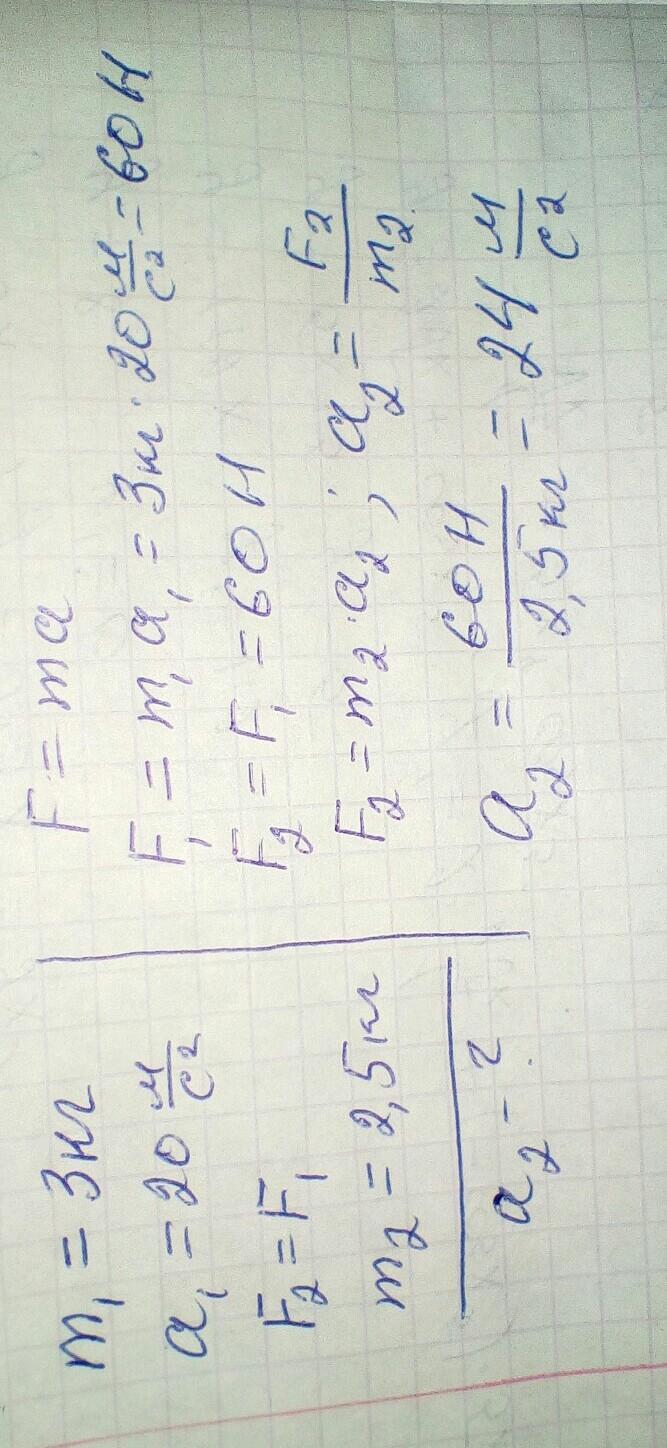 силы тело массой 3 кг получает ускорение 20 м / с². Масса этой силы придает любое ускорение телу 2,5 кг.