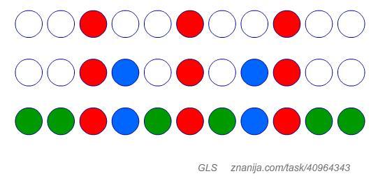 Выполняется условие: из любых трёх идущих подряд кружочков должен быть хотя бы один красный.