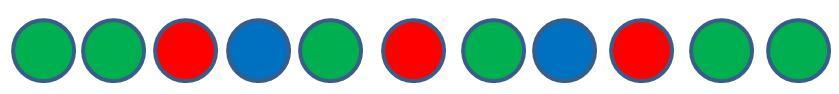 Остаётся 3 кружочек посередине. Так как эти 3 кружочка расположены между 2 синими кружочками, то 2-условие выполняется. Чтобы получить (3-условие) 6 зелёных кружочек 2 из 3 кружочек посередине покрасим на зелёный и чтобы выполнилась 1-условие 1 из них покрасим на красный цвет.