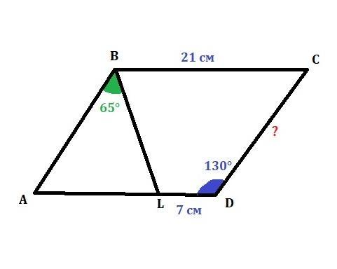Дан параллелограмм ABCD, ∠D=130∘, BC=21 . На стороне AD есть такая точка L, что ∠ABL=65∘, LD=7. Найдите длину CD.