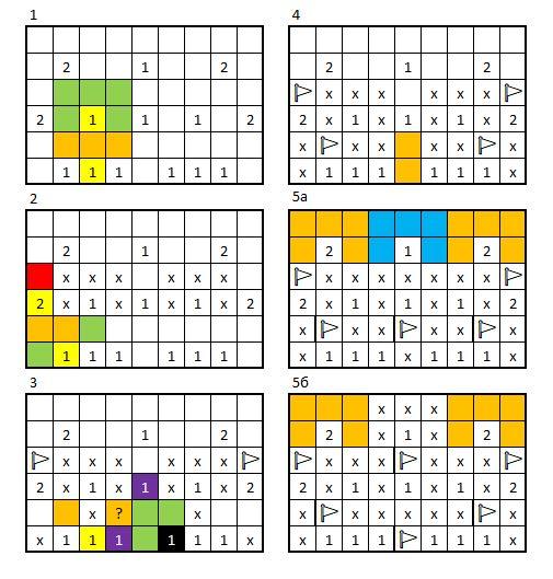 См. рисунок. Мины отмечены флажками, клетки без мин — буквами х. На шагах 1–3 логика применяется симметрично слева и справа.