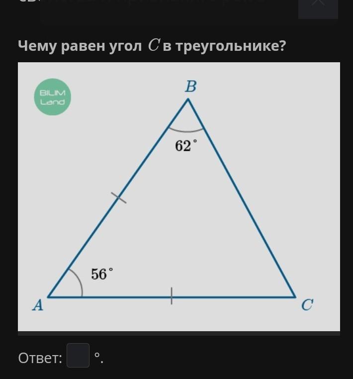основание у тебя BC, значит ∠В=∠С, значит ∠С=62°
