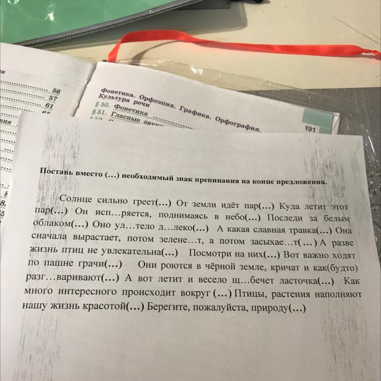 Солнце сильно греет. От зесли идёт пар. Куда летит этот пар? Он испаряется, поднимаясь в небо. Последи за белым облаком. Оно улетело далеко. А какая славная травка! Она сначала вырастает, потом зеленеет, а потом засыхает. А разве жизнь птиц не увлекательна? Посмотри на них. Вот важно ходят по пашне грачи. Они роютмя в черной земле, кричпт и как будто разговаривают. А вот летит и весело щебечет ласточка! Как много интересного происходит вокруг! Птицы, растения наполняют нашу жизнь ркасотой. Берегите, пожалуйста, природу!