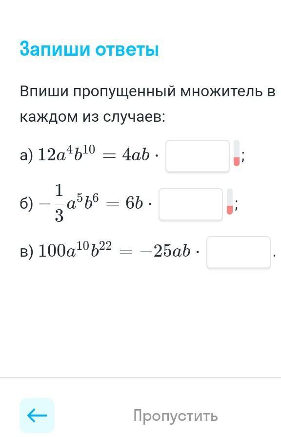 в) 100a^10b^22/(-25ab)=-4a^(10-1)b^(22-1)=-4a^9b^21
