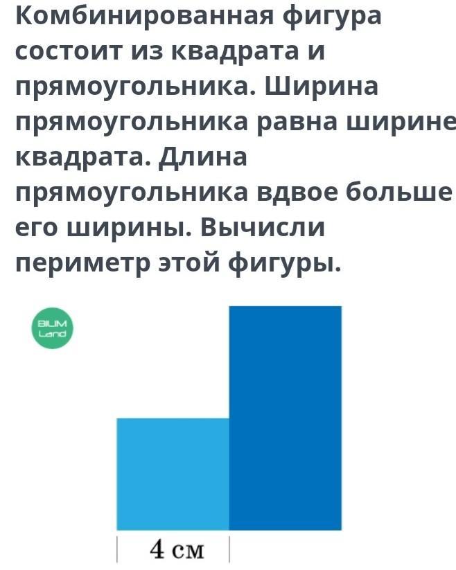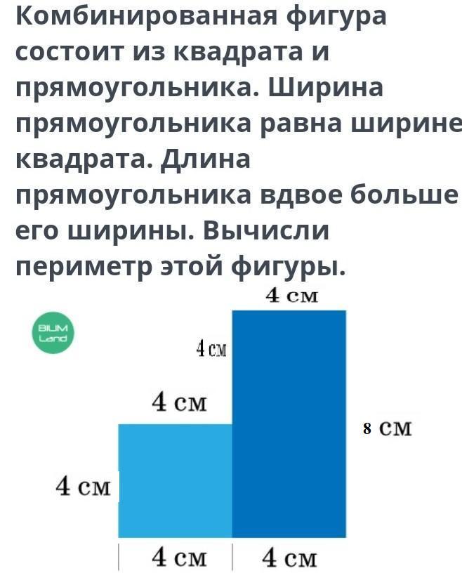 На рисунке подписаны длины сторон. У квадрата все стороны равны. Длина прямоугольника 4*2= 8 см (в два раза больше по условию). Получается 8 равных отрезков по 4 см