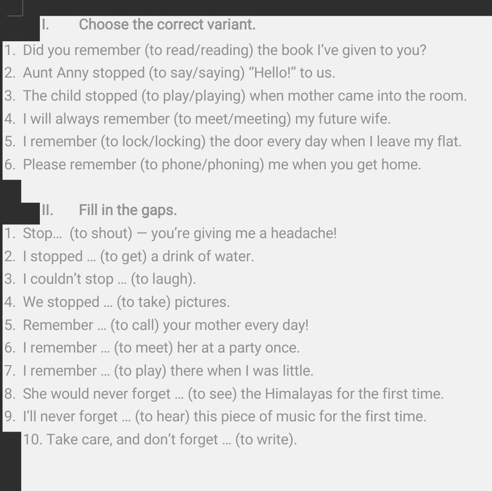 1. Did you remember (to read/reading) the book I’ve given to you?
