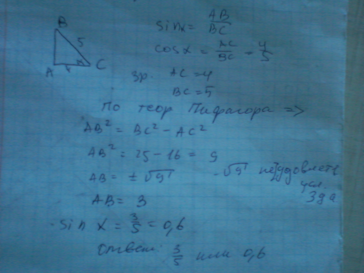 из формулы sin²a+cos²a=1 следует что sina=√1-cos²a=√1-16/25=√9/25=3/5