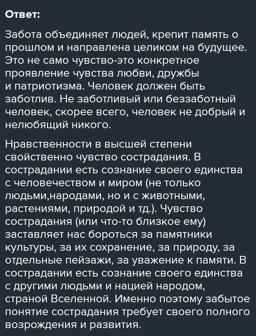 Забота объединяет людей, крепит память о прошлом и направлена целиком на будущее. Это не само чувство-это конкретное проявление чувства любви, дружбы и патриотизма. Человек должен быть заботлив. Не заботливый или беззаботный человек, скорее всего, человек не добрый и нелюбящий никого.
