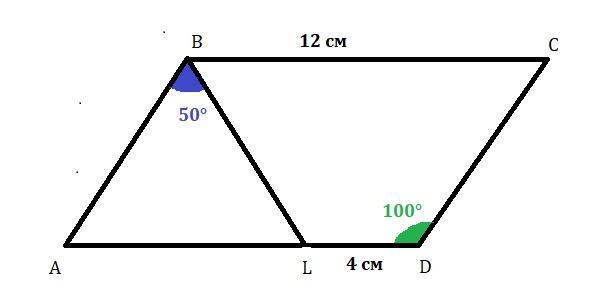 дан параллелограмм ABCD, угол D = 100°, BC = 12. На стороне AD есть такая точка L, что угол ABD = 50°, LD = 4. Найдите длину CD
