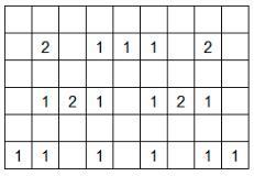 На поле игры «Сапёр» в некоторых клетках стоит по одной мине. В остальных клетках расставлены числа, равные количеству мин в соседних (по стороне или углу) клетках. На поле 9×6 известны некоторые числа, как показано на рисунке.