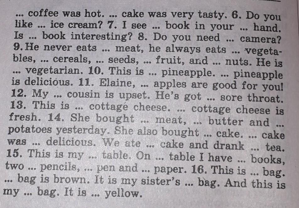 12. My cousin is upset. He's got a sore throat. 13. This is a cottage cheese. The cottage cheese is fresh. 14. She bought a meat, a butter, and the potatoes yesterday. She also bought a cake. The cake was delicious. We ate the cake and drank the tea. 15. This is my table. On the table I have books, two pencils, a pen, and a paper. 16. This is a bag. The bag is brown. It's my sister's bag. And this is my bag. It is yellow.