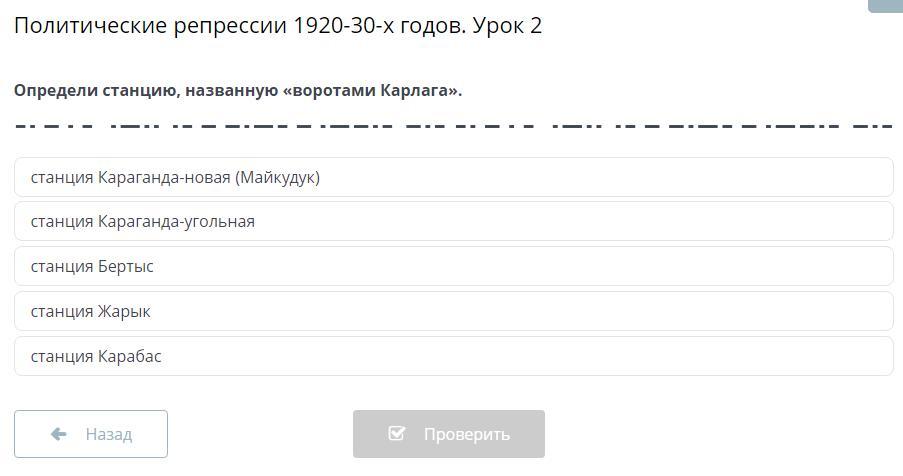 Определи станцию, названную «воротами Карлага». станция Караганда-новая (Майкудук) станция Караганда-угольная станция Бертыс станция Жарык станция Карабас