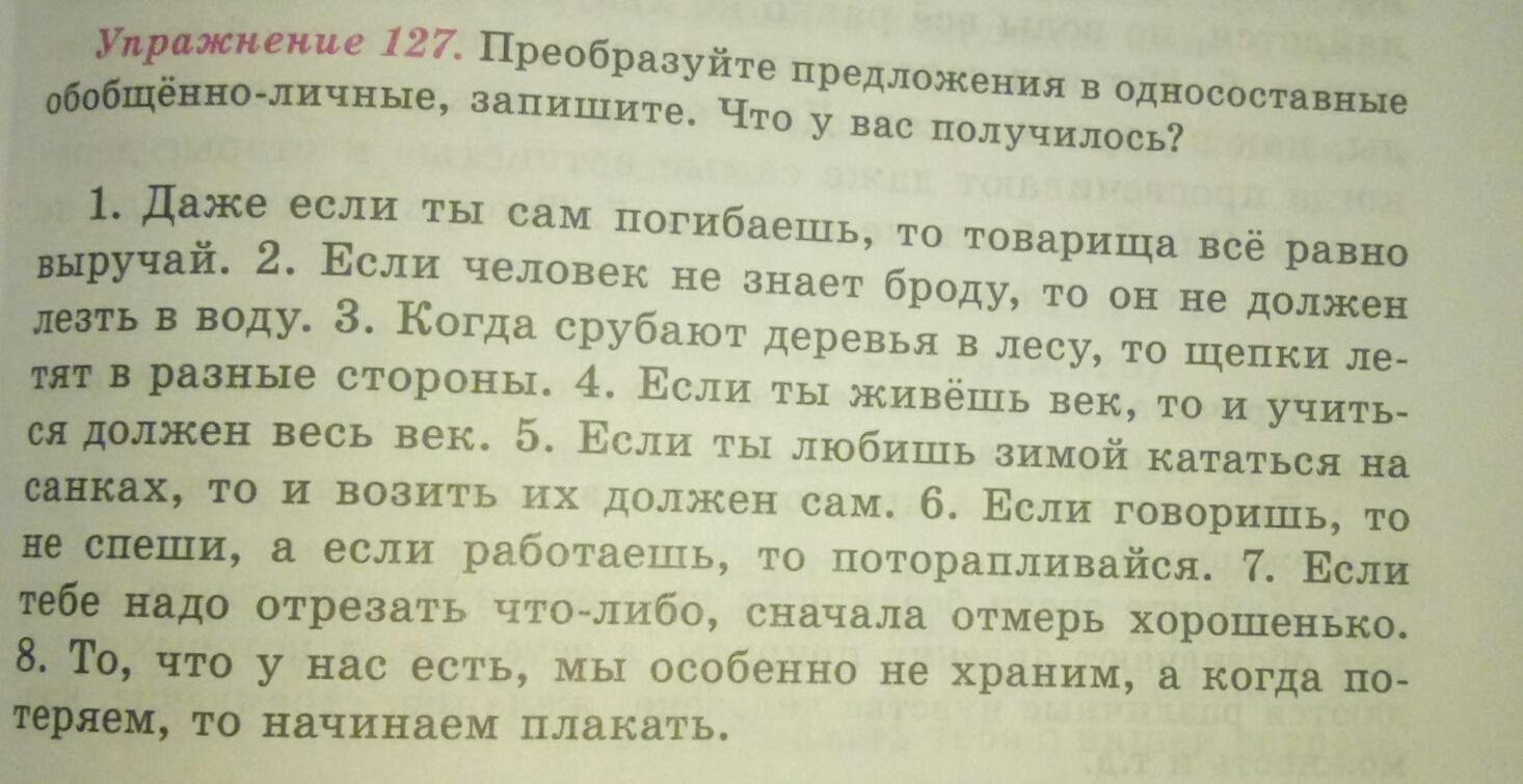 127 упражнение. Преобразуйте предложения в односоставные обобщённо-личные, запишите. Что у вас получилось?