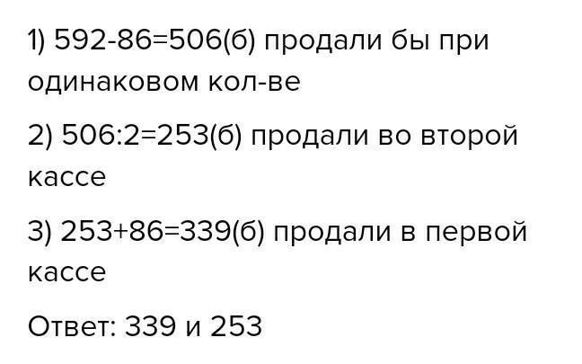 В двух кассах стадиона продали 592 билета.Сколько билетов было продано в каждой кассе, если в первой продали на 86 билетов больше?