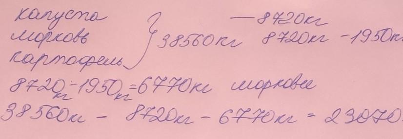 В магазин привезли 38560 кг овочів. Капусти було 8720 кг, моркви на 1950 кг менше, решта була картопля. Скільки привезли кг картоплі