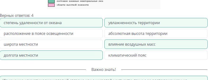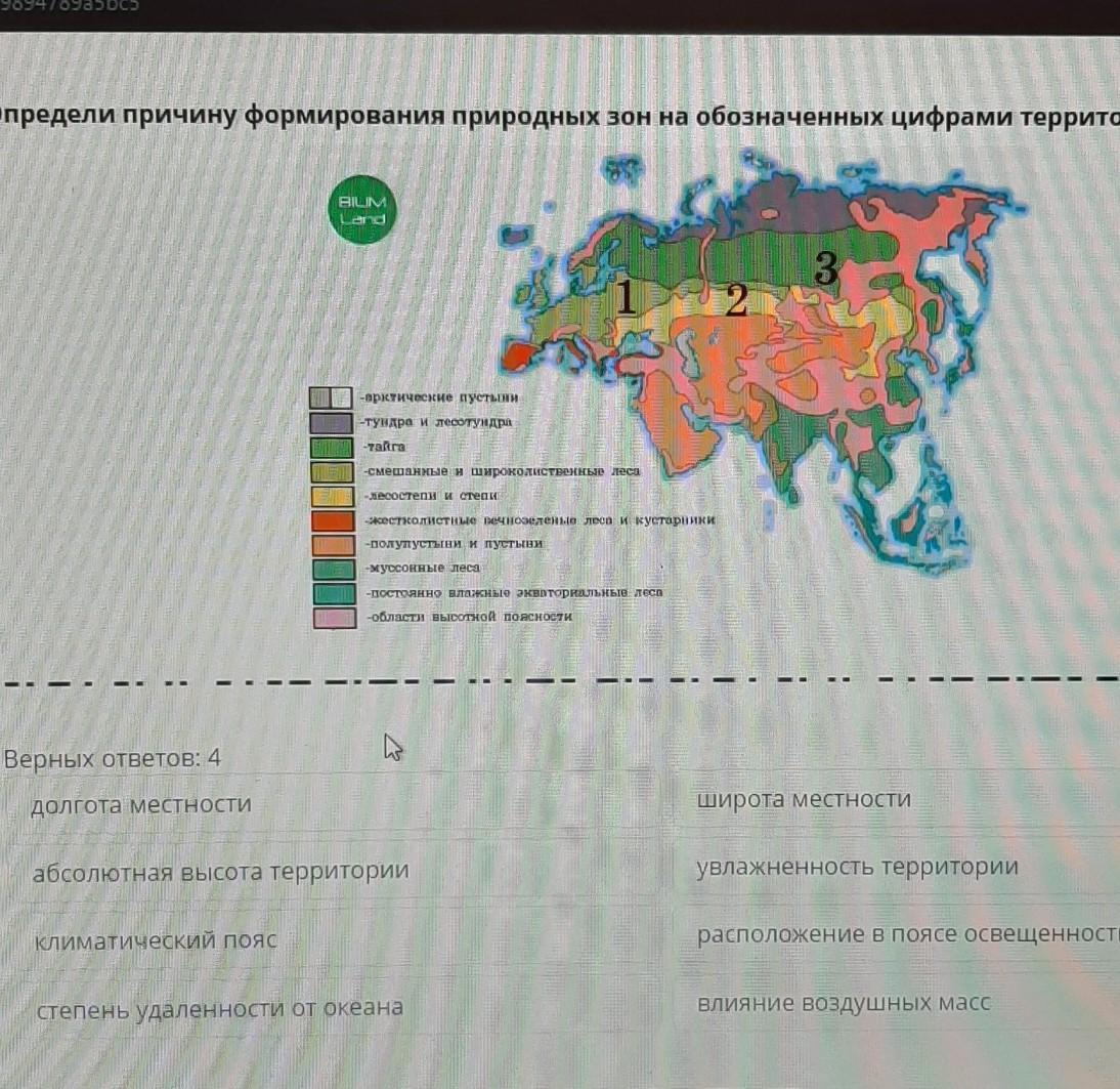 определи причину формирования природных зон на обозначенных цифрами территориях.верных ответов :4 срочнооо