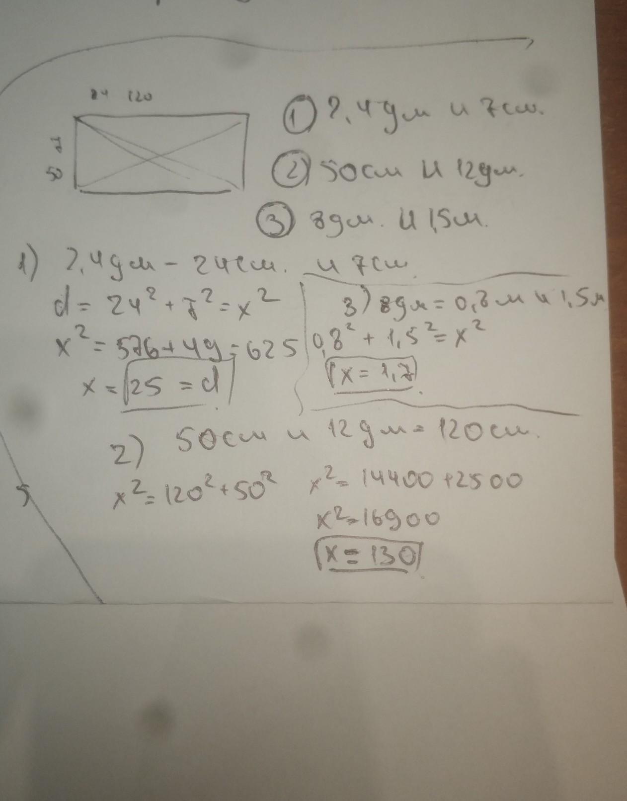 Найдите диаганаль прямоугольника,если его стороны равны: 1) 2,4 дм и 7 см; 2) 50 см и 12 дм 3) 8 дм и 1,5 м