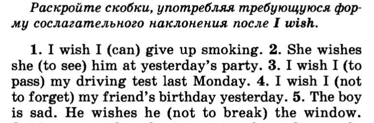 1. I wish I can't give up smoking.2. She wishes she to seemed him at yesterday's party.3. I wish I to passing my driving test last Monday.4. I wish I not to forgetting my friend's birthday yesterday.5. The boy is sad. He wishes he not to breaking the window