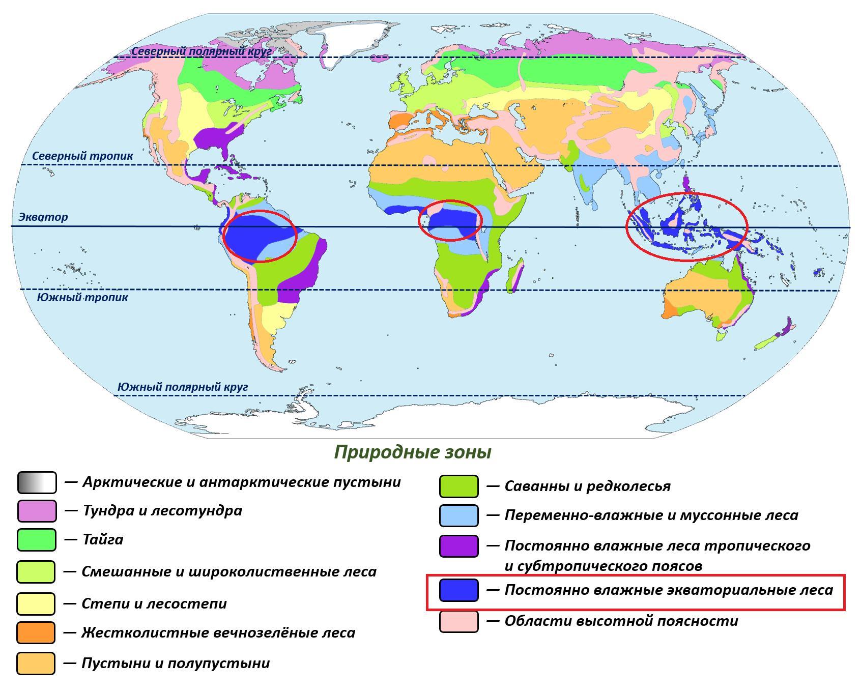 Как видно из карты, которая дана ниже в приложении, ближе всего к экватору располагается зона влажных экваториальных лесов.